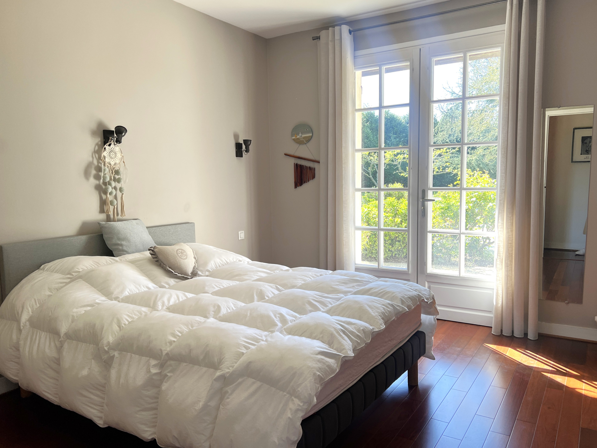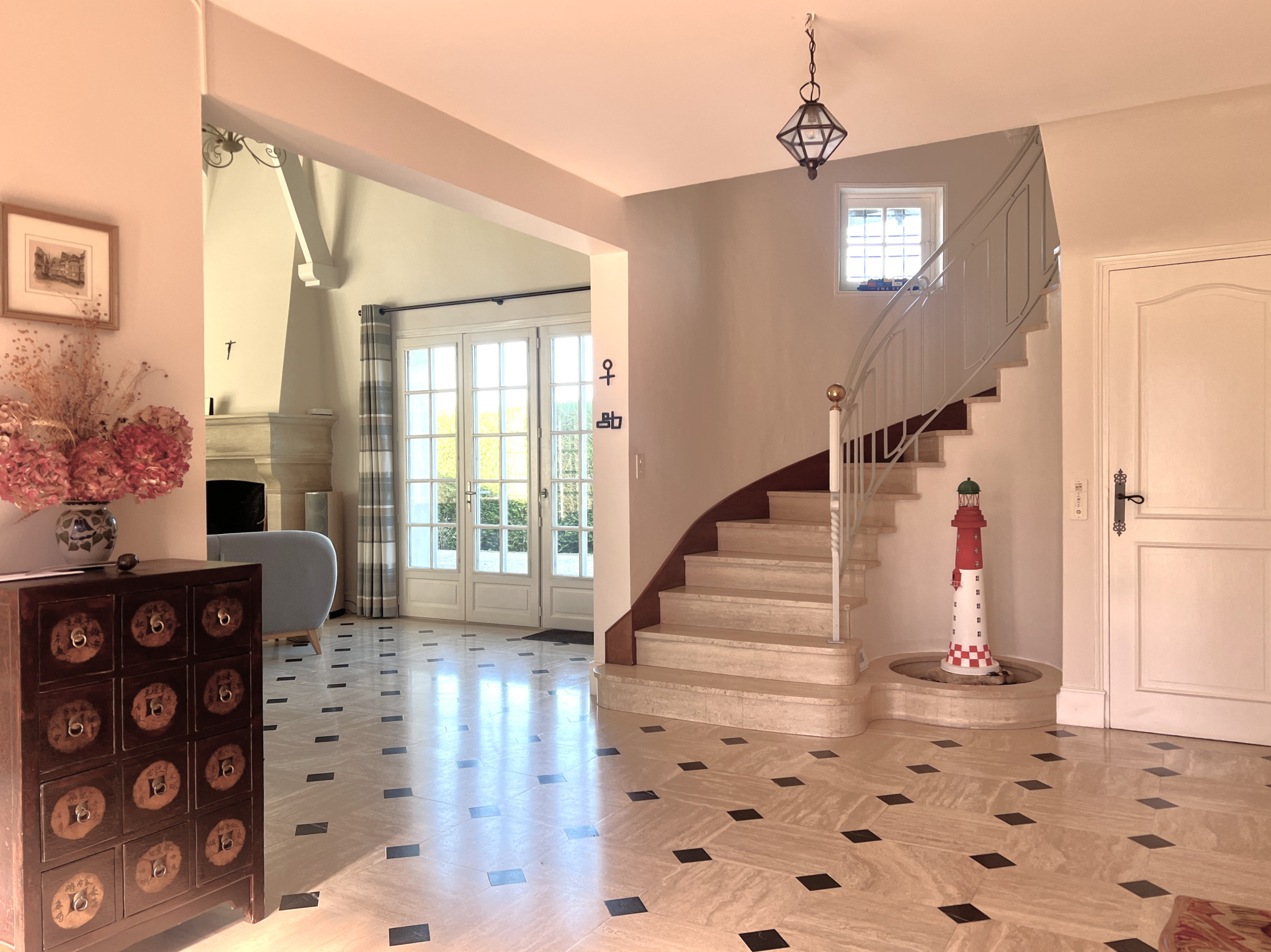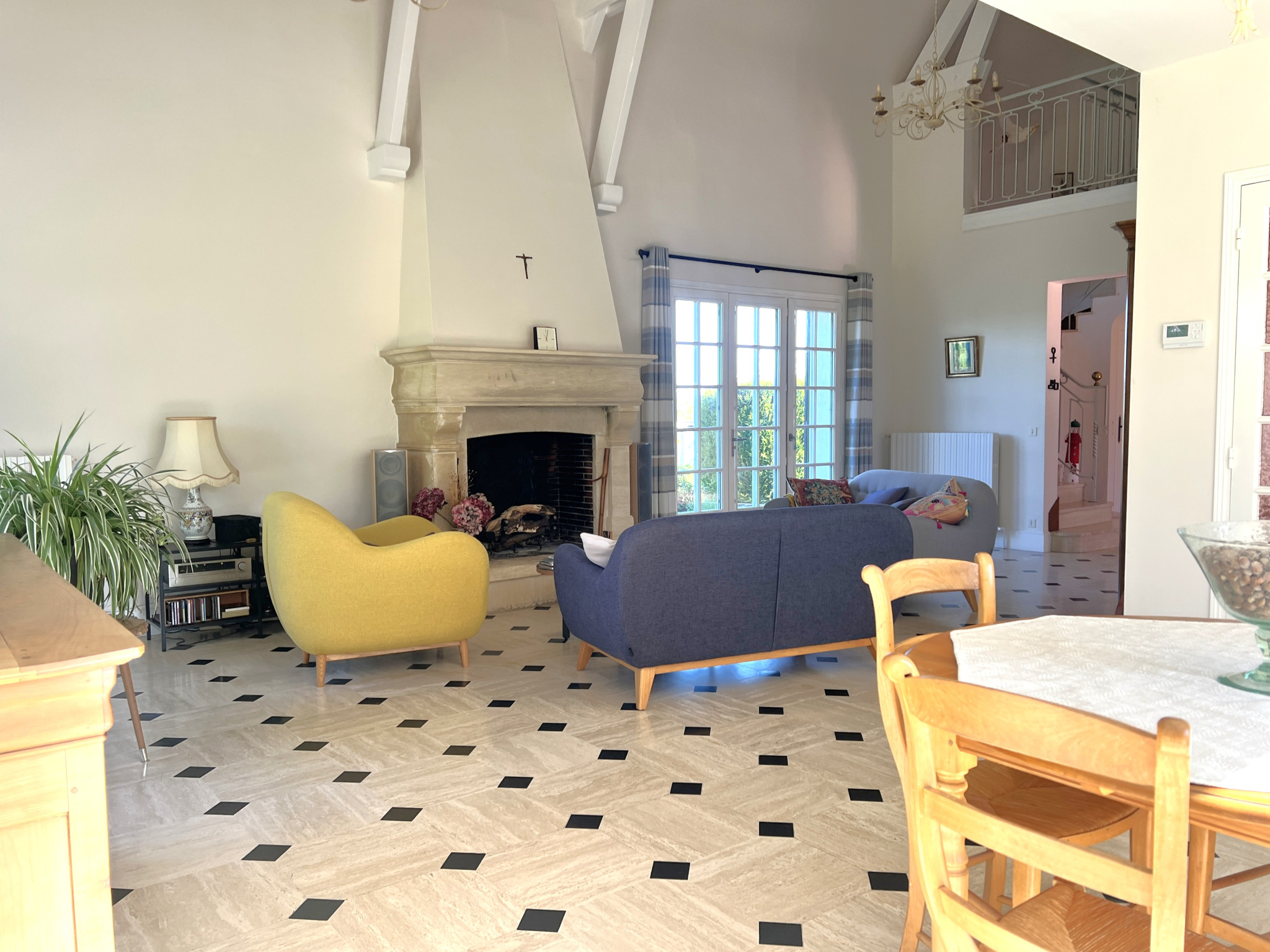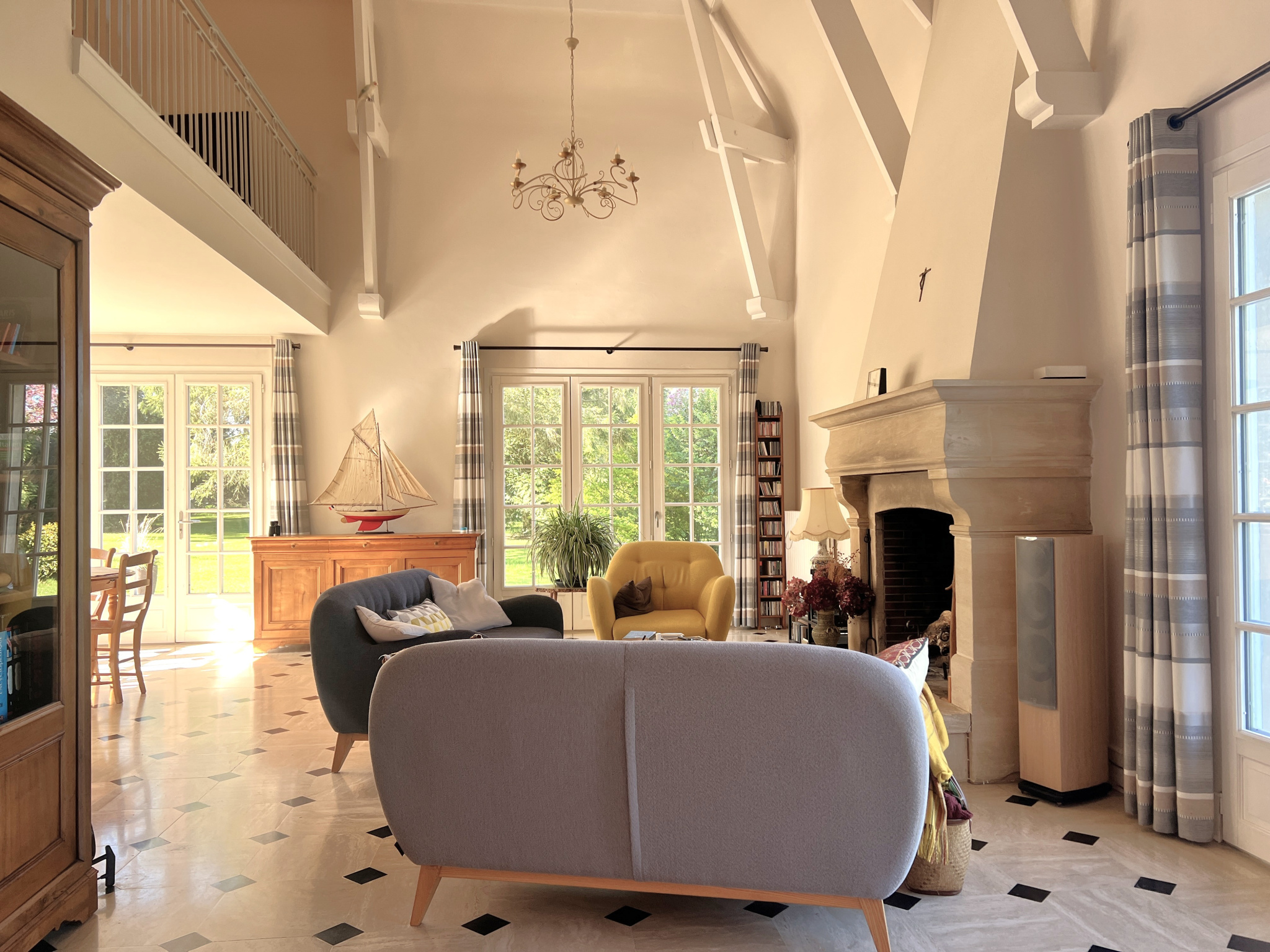 Dès l'entrée, les volumes et la qualité des matériaux donnent le ton. Le séjour de 48 m2, baigné de lumière grâce à son exposition sud/sud-ouest, offre un espace de vie chaleureux sublimé par un sol en travertin et une cheminée en pierres de Caen, véritable pièce maîtresse de la maison. La cuisine aménagée et équipée, s'intègre parfaitement dans la continuité des espaces de vie. Le rez-de-chaussée permet une véritable vie de plain-pied avec plusieurs chambres, dont une suite parentale comprenant dressing et salle de bain, offrant confort et intimité. À l'étage, la mezzanine apporte un espace supplémentaire plein de charme, idéal en salle TV ou bibliothèque, desservant plusieurs chambres aux beaux volumes ainsi qu'une salle de bain.